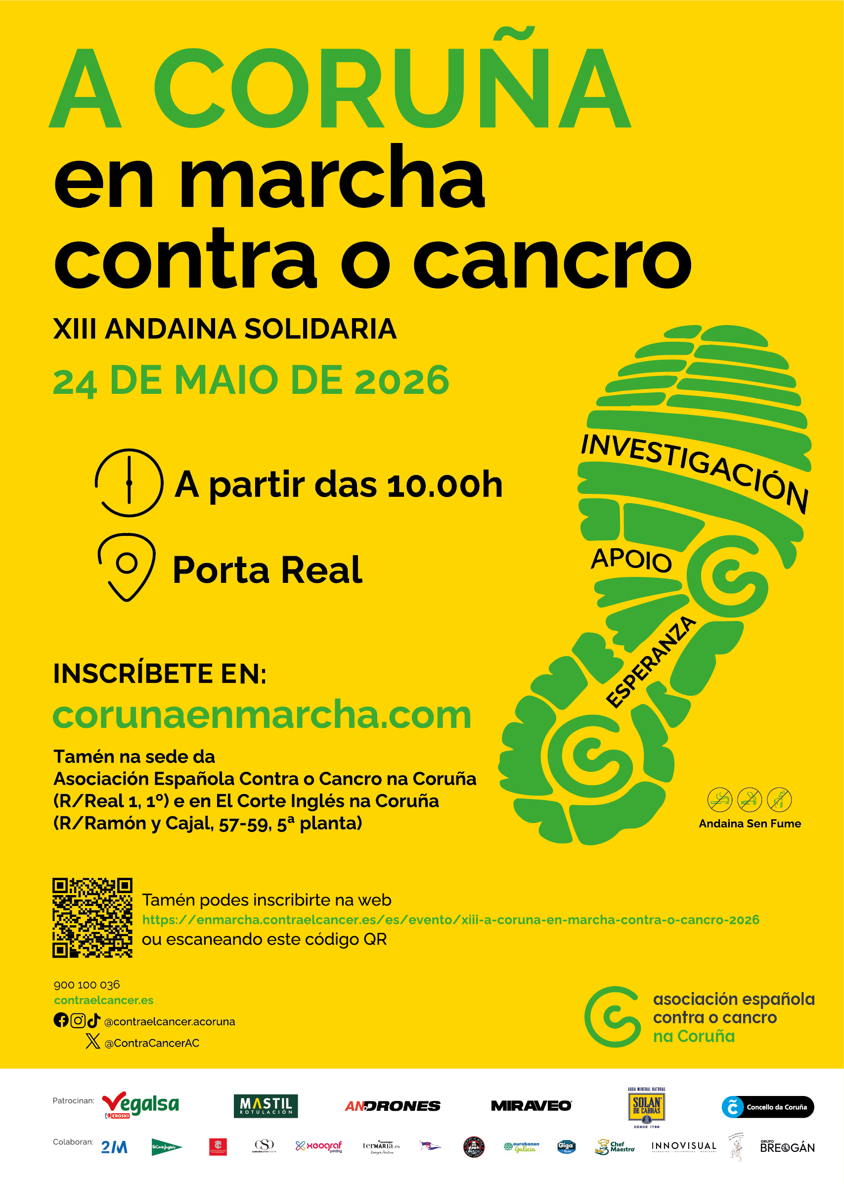 A Asociación Española Contra o Cancro organiza, o vindeiro domingo 24 de maio de 2026 a XII Edición da andaina solidaria A Coruña en Marcha contra o cancro.